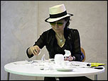 Die 72-jährige Künstlerin zeigte sich bei der Vorbesichtigung angetan von den Ideen der Kunststudenten. Sie selbst malte zunächst einen Punkt mit weißer Farbe auf weiße Leinwand und signierte das Bild mit roter Farbe. Danach wandte sie sich einem «Mend Piece» (Bild) zu: Sie machte sich daran, eine zerbrochene weiße Porzellan-Untertasse wieder zusammenzukleben.